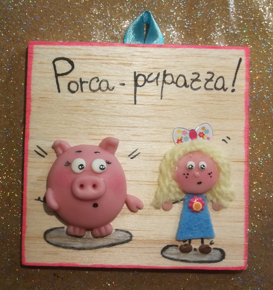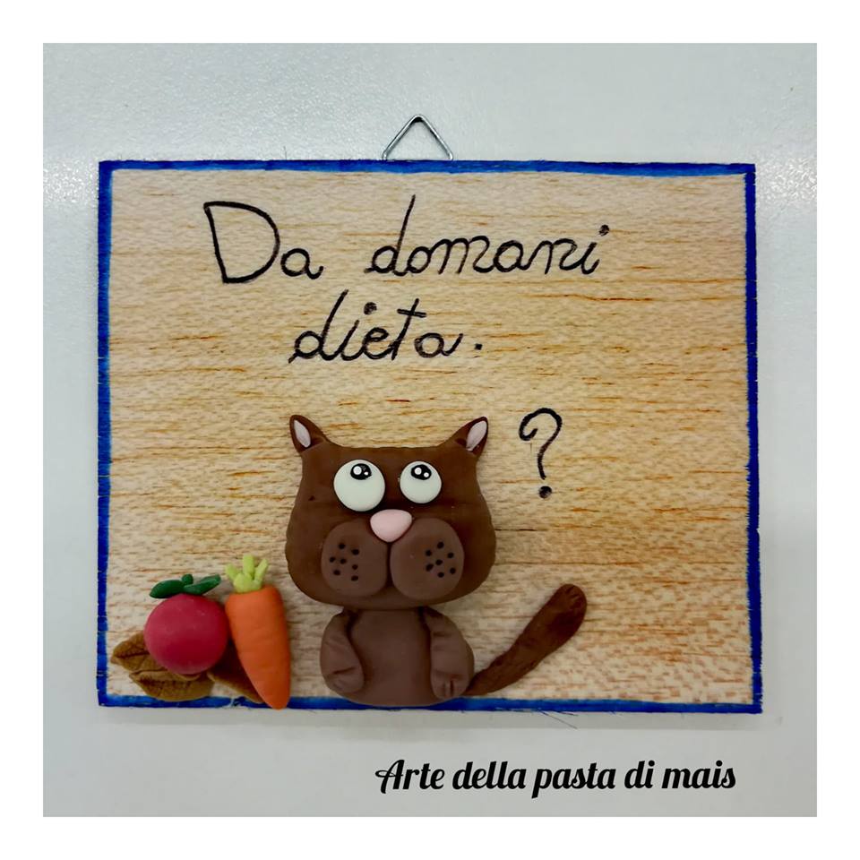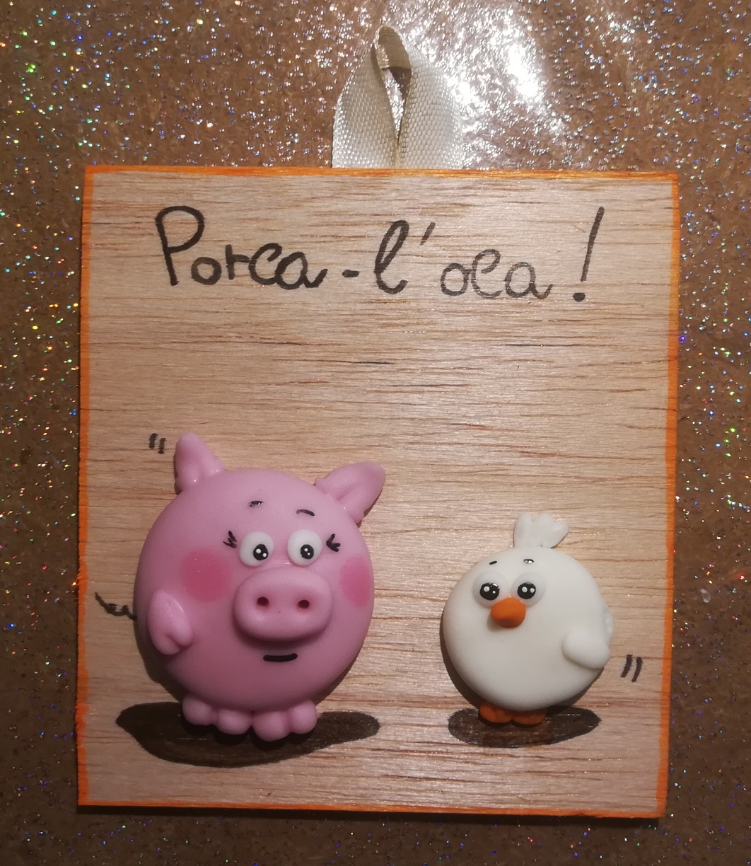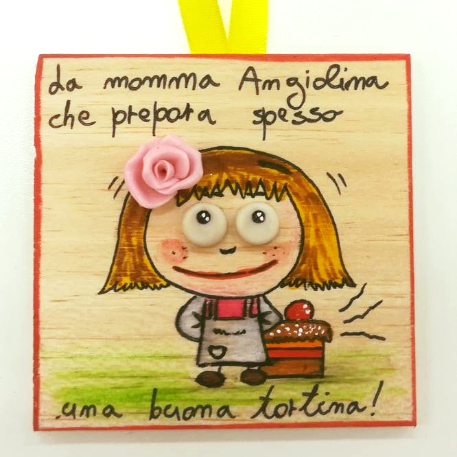 Targhetta in legno decorata con la pasta di mais.